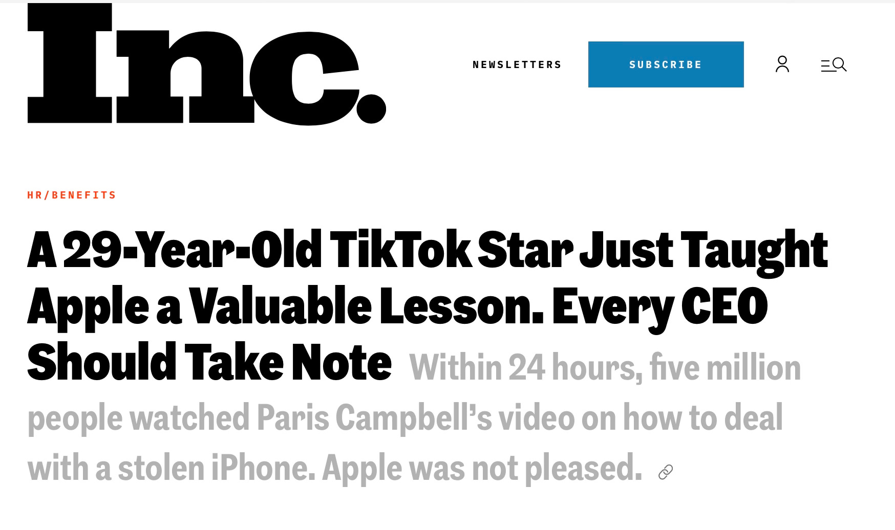 A couple months after the fire, I was in my new apartment, feeling crazed, likely while taking a break from unpacking, and I came across a video on my FYP of a woman asking for help with her stolen iPhone. Having worked for Apple for five years, I knew exactly what her issue was, and for some reason I decided to stitch the video. I didn’t directly identify myself as an Apple employee, but I definitely alluded to it. Apple had never mentioned knowledge of my TikTok videos before, but it didn’t take long for this to spin out of control. The video went super-viral, next level viral. At this moment, it has 13 million views, and almost 2 million likes. The original video got picked up by a couple news outlets as general advice on how to deal with a stolen iPhone, and this prompted Apple to contact me about it within a matter of a couple days. From the moment I spoke to my manager, I knew I’d be fired over the video - one way or another. At first, he was asking me to remove the video, but I pushed back. I hadn’t technically violated any of the company’s standing policies at that time, and I knew that. It wasn’t against the rules for me to make a video about public-facing information regarding Apple’s products. It wasn’t even against the rules for me to publicly identify myself as an Apple employee. I was strategic in how I worded my responses on the call, citing policy I had pulled up through the company’s HR website. The call ended with my manager asking me to do “nothing, for now” - do not delete the video, please do not make any more videos about anything Apple related, and wait to hear back for further guidance.